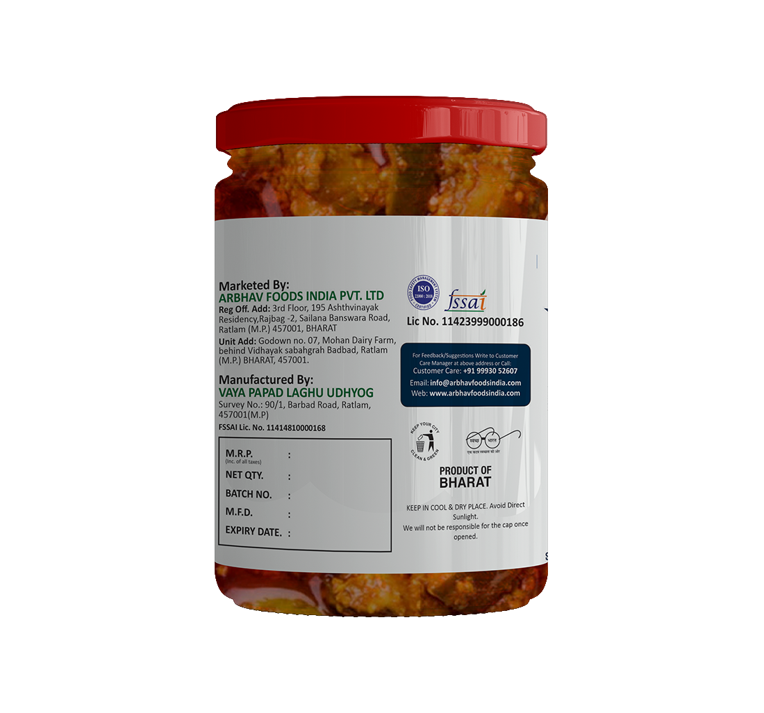Searching for a pickle shop near you? You have reached the right place. This is where the art of pickle making is lovingly passed down through generations. Each jar of pickles is meticulously handcrafted in small batches, using age-old family recipes that capture the true essence of Madhya Pradesh cuisine. our Mango Pickles are crafted using only the freshest ingredients sourced locally. Experience the diverse flavours of Madhya Pradesh right in the comfort of your own home with Arbhav Foods. Discover the true essence of Madhya Pradesh with our Mango Pickles, the epitome of authentic flavours. Arbhav Foods Pickle has always been renowned for its tangy, spicy, and irresistible taste, leaving your taste buds yearning for more.