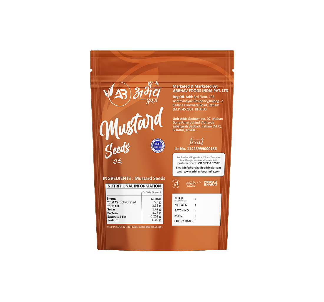 Mustard seeds or rai are one of the common kitchen ingredients. Mustard seeds or Rai are tiny, strong flavoured seeds used most commonly in Indian cuisines. Tiny mustard seeds have an interesting bite and they contribute to the exotic flavor and aroma of Indian food. These small round seeds are usually added while tempering a dish to enhance its aroma. Mustard seeds are also used in pickles for aroma and texture.They are commonly used in pickling, sausage-making and tempering vegetable dishes. Arbhav Foods Mustard Seeds are naturally grown and hygienically sealed to retain the goodness of mustard seeds.